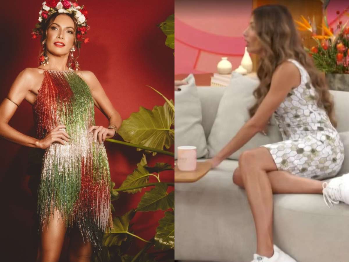 Patrícia Poeta usa look com 100 mil cristais em ensaio, sofre acidente e usa tênis no 'Encontro'