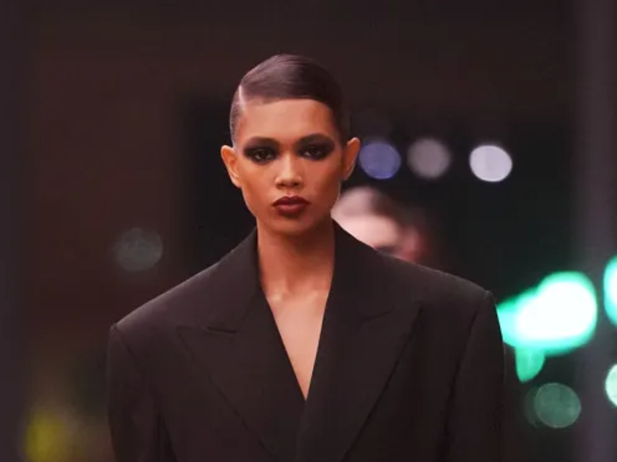 Thalita, representada pela agência Evol MGMT, deu o start à coleção outono-inverno da Yves Saint Laurent com conjunto de alfaiataria em preto absoluto, formado por blazer estruturado, com ombros marcados e cintura ajustada, combinado a calça de corte amplo e alongado, reforçando a silhueta sofisticada característica da marca.