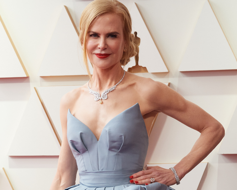 O cristal brilha em looks que trazem cores além do metalizado em prata e ouro. Bege, azul e lilás levaram luz aos tapetes vermelhos. A cantora Becky G apostou num longo reto, tipo colunam mas com volume no quadril, da Etro. O vestido com leve transparência azul de Doja Cat no Grammy é da Versace. Já a ganhadora do Oscar Jessica Chastain apostou no dourado com lilás, num modelo fabuloso, que traz barra com volume, da Gucci.