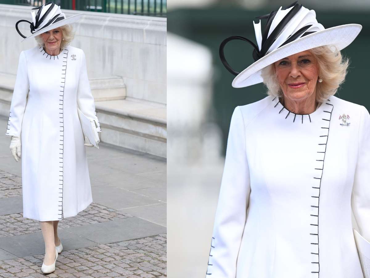 Para a ocasião solene, Camilla apostou em uma composição sofisticada que reforça sua assinatura de estilo. A união entre o clássico e a elegância contemporânea. Contudo, a rainha elegeu um vestido midi branco, com mangas longas e decote redondo, assinado pela estilista britânica Anna Valentine. Vale destacar que a designer é uma das criadoras favoritas da rainha consorte.