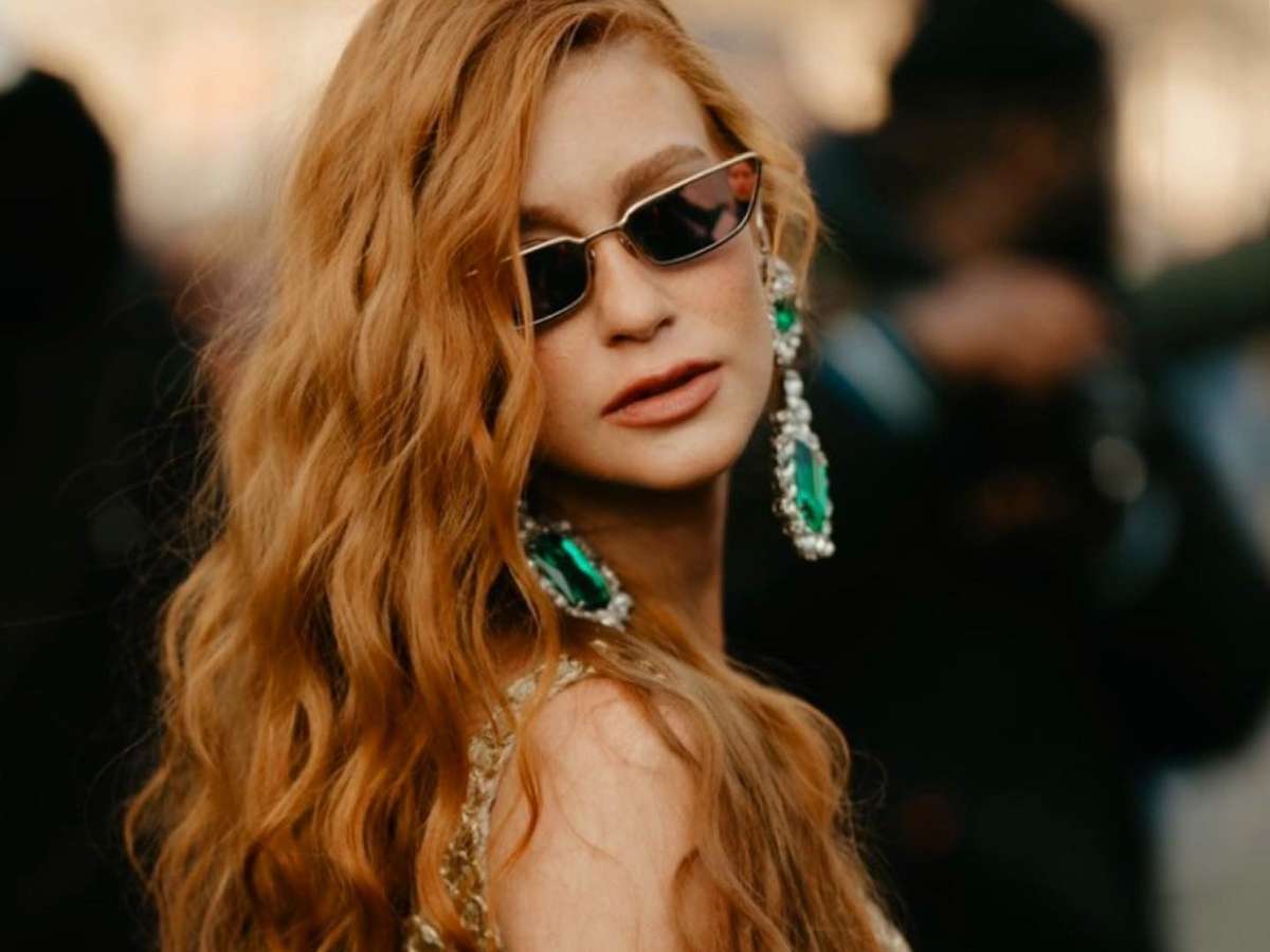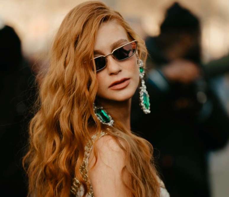 O look poderoso da atriz e dona da marca Ginger e do estilista que desfilou no último dia da Semana de Moda de Paris, na terça (8). Com stylist de Pedro Salles, diretor de moda da revista Vogue Brasil, Marina Ruy Barbosa completou o look com bolsa dourada, sapato brilhante e maxibrinco com pedras verdes, além de óculos de sol de tamanho pequeno.