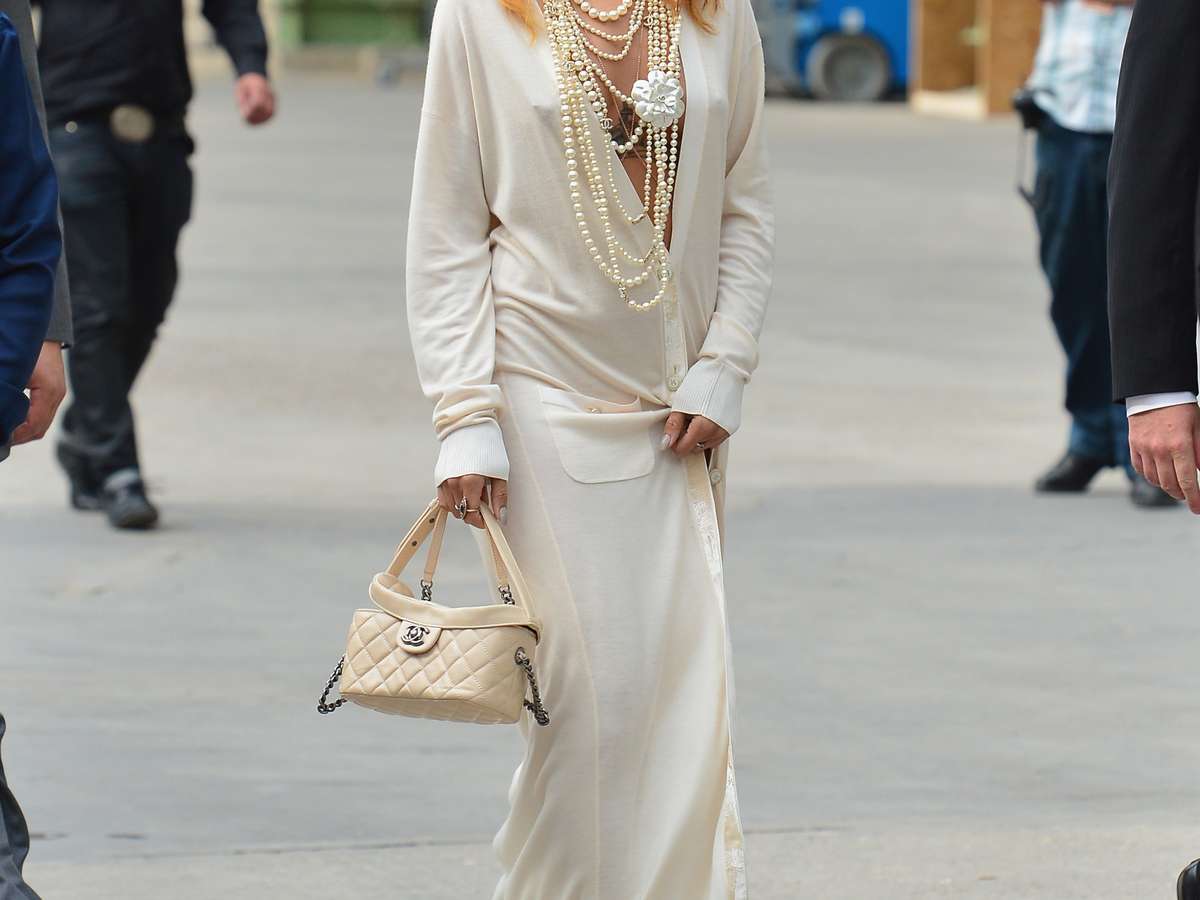O casaco leve e longo que Rihanna veste deixa aparecer o sutiã, a barriga e com a fenda imensa, suas pernas, quase fazendo aparecer a calcinha. Não parece um roupão de banho? Na mão, uma bolsa Chanel, que se não estivesse acompanhada do "robe de chambre" passaria como um acessório bem legal. Mas aqui, parece mesmo um nécessaire. Já o clássico sapato bicolor e as pérolas com a camélia estão bem legais e são um dos ícones da marca francesa