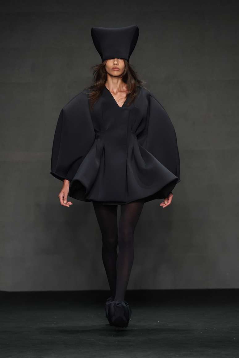 Na passarela, isso se traduz em vestidos de presença forte, com mangas estruturadas, drapeados e saias que crescem em volume até ganhar comprimentos longos. As peças parecem tensionadas entre maciez e rigidez, criando formas quase escultóricas, como se fossem erguidas no corpo. Há uma sensação de movimento contido, de algo que se expande, mas com controle. Calçados da mesma cor das peças envolvem os pés com delicadeza, lembrando os pró-pés de clínicas médicas, como uma forma de proteção.