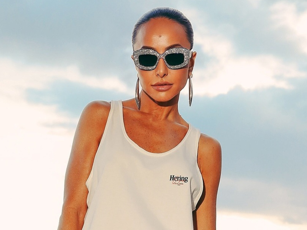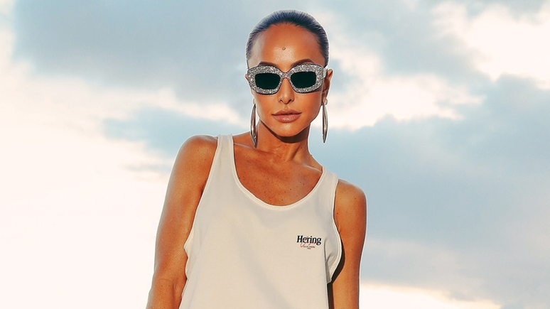 Estava de camiseta branca tipo regata e com calça (R$ 239,99) reta em tule com estampa de ondas, em azul e branco. Para completar, óculos de sol com armação nada básica, repleta de brilho prateado.