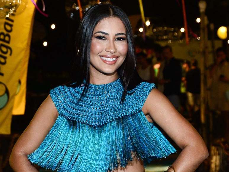 O look azul em degradê, composto por saia e top, de Thaynara OG, vem com franjas e trabalhos manuais, o que valoriza o artesanato brasileiro. Nos pés, mule transparente, que é tendência.