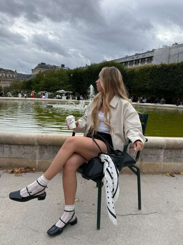 A sapatilha estilo boneca com tiras aparece combinada com meia clara delicada. O efeito é romântico com pegada retrô.