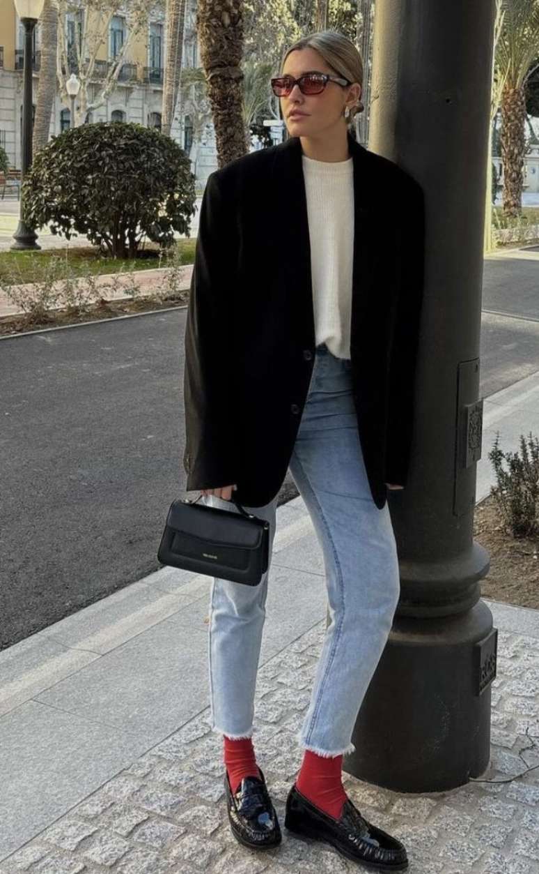 O jeans reto com barra cropped deixa a meia em evidência. O blazer oversized preto traz elegância e equilíbrio. É a prova de que um detalhe colorido muda tudo. Ideal para quem quer sair do óbvio sem exagerar.