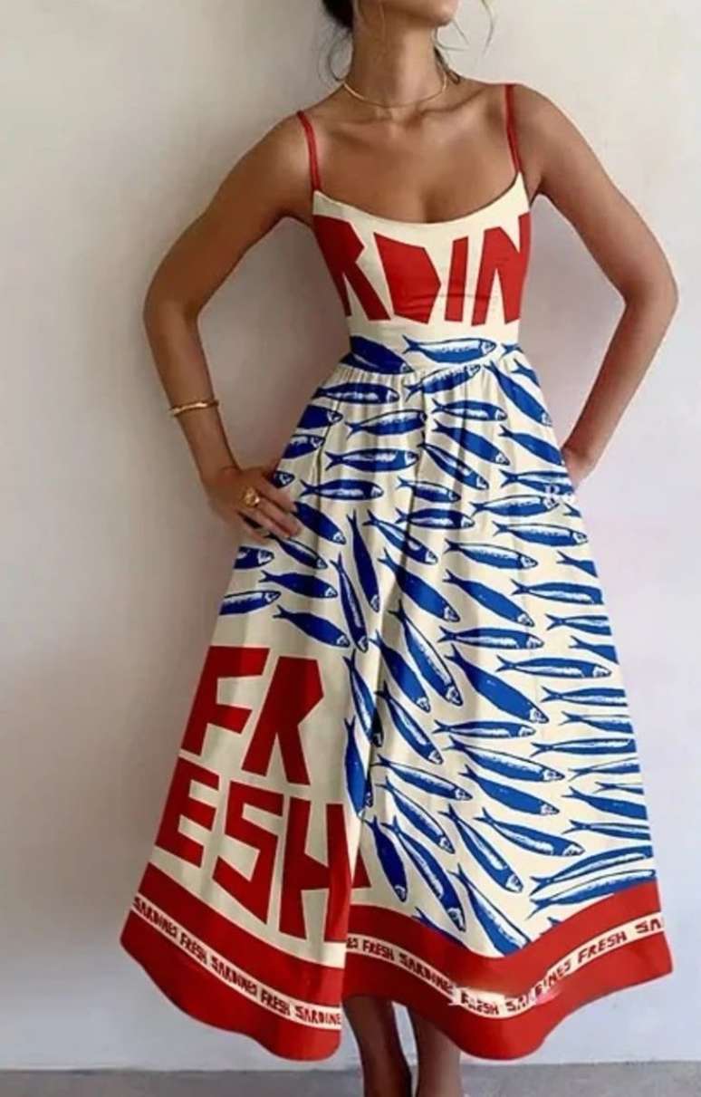 Vestidos: Para quem gosta de ousar, os vestidos com estampas de sardinha são um statement de estilo. Pode ser uma estampa repetitiva ou uma versão artística, com sardinhas grandes e vibrantes. Um vestido assim fica super charmoso para eventos casuais, jantares informais ou até passeios à beira-mar.