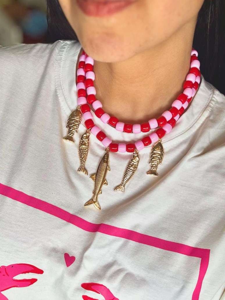 Quem prefere algo mais discreto pode apostar nas bijuterias com a estampa de sardinha. Colares, brincos e anéis com desenhos divertidos do peixe são uma maneira fofa de aderir à tendência. Escolha peças delicadas, como colar de sardinha em ouro ou prata, para dar um toque moderno e elegante, mas ainda dentro da proposta descontraída da tendência. As bijuterias podem ser usadas no dia a dia, criando um look leve, mas com muita personalidade.