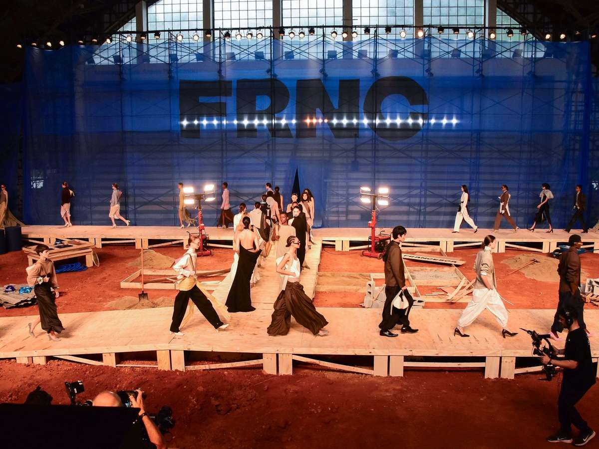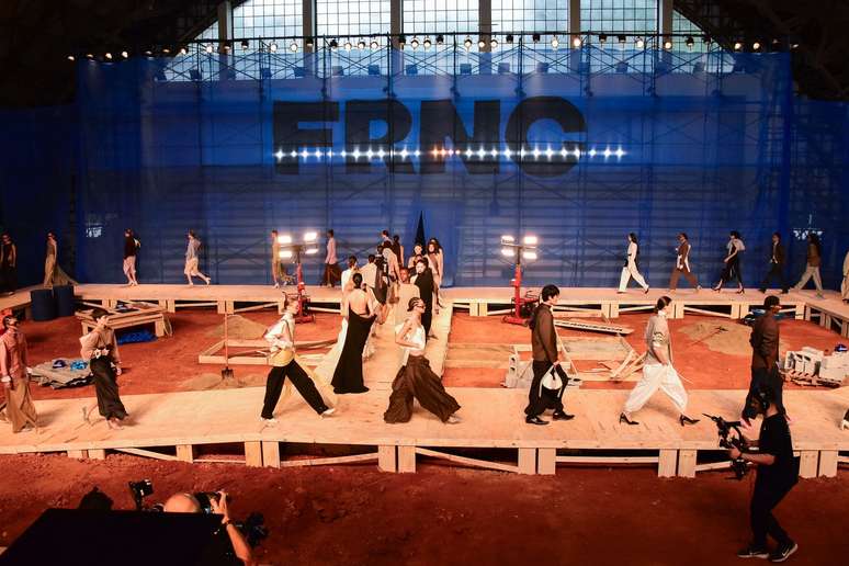 Com passarela feita em madeira de construção e andaimes cobertos com tela transparente com o logotipo FRNC estampado, as modelos desfilavam entre a madeira e a terra do chão ainda sem terminar.