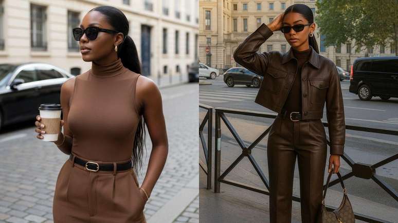 Vamos focar no couro e no tricô, os favoritos para os dias mais frescos. Essas texturas em tons de café e cacau trazem uma profundidade incrível para a produção.