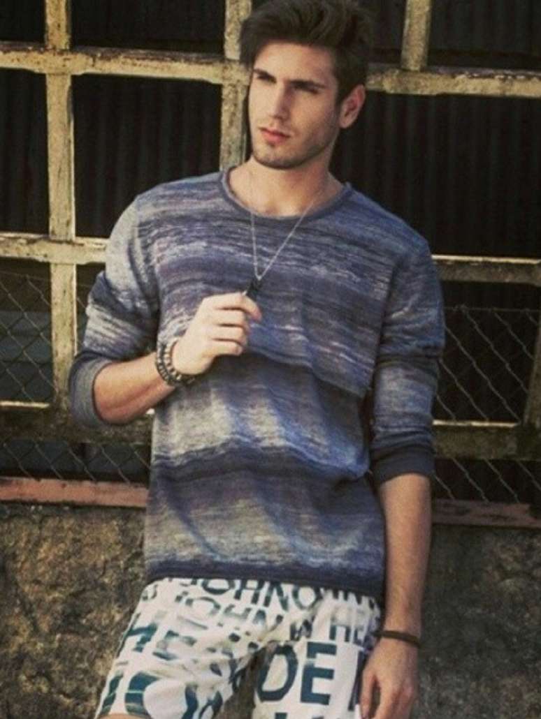 Na imagem, ele veste uma malha de manga comprida com padronagem horizontal, em tons de azul, branco e preto. A peça combina com uma bermuda branca escrita John John Denim em azul.