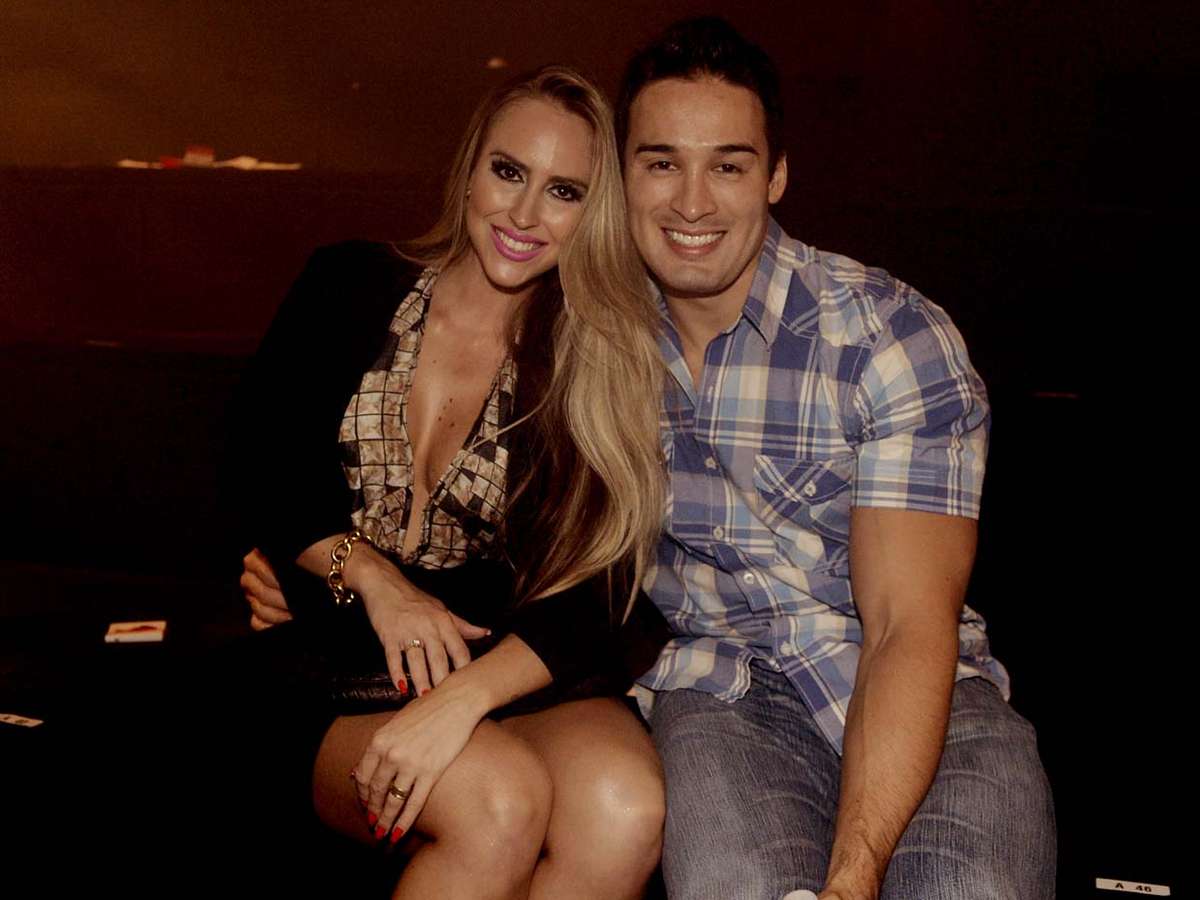 O humorista Felipe Andreoli aguarda o início do desfile da Triton ao lado da mulher, a apresentadora Rafaella Brites