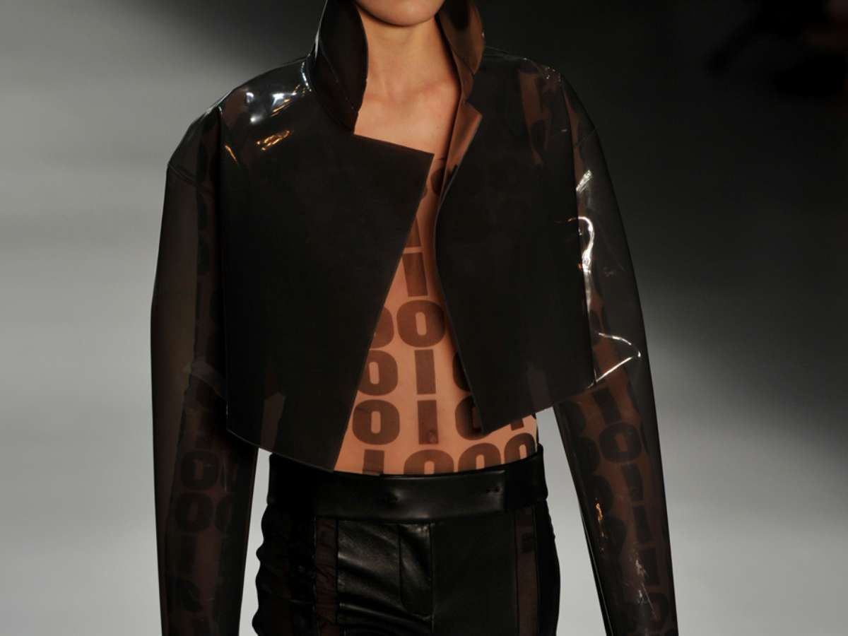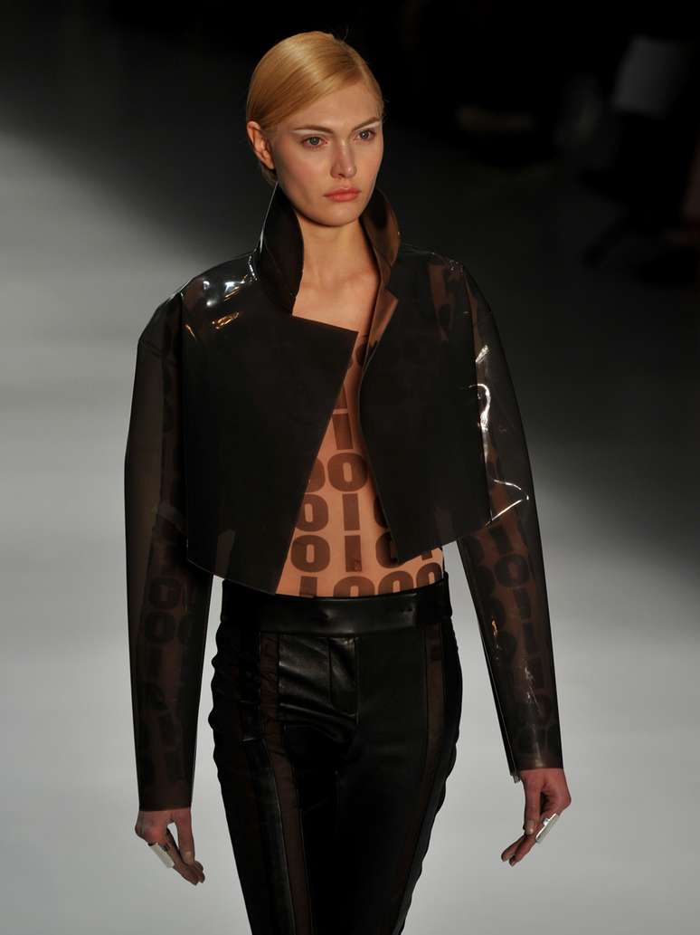 A princípio pode ser bastante difícil visualizar o que Gloria quer mostrar, mas, segundo ela, "toda essa rapidez, as partículas que se desaparecem durante esse processo e toda essa energia estão na coleção", disse. "Vai ter muito grafismo e excesso de swarovski", acrescentou. Na foto, look da coleção de verão 2013