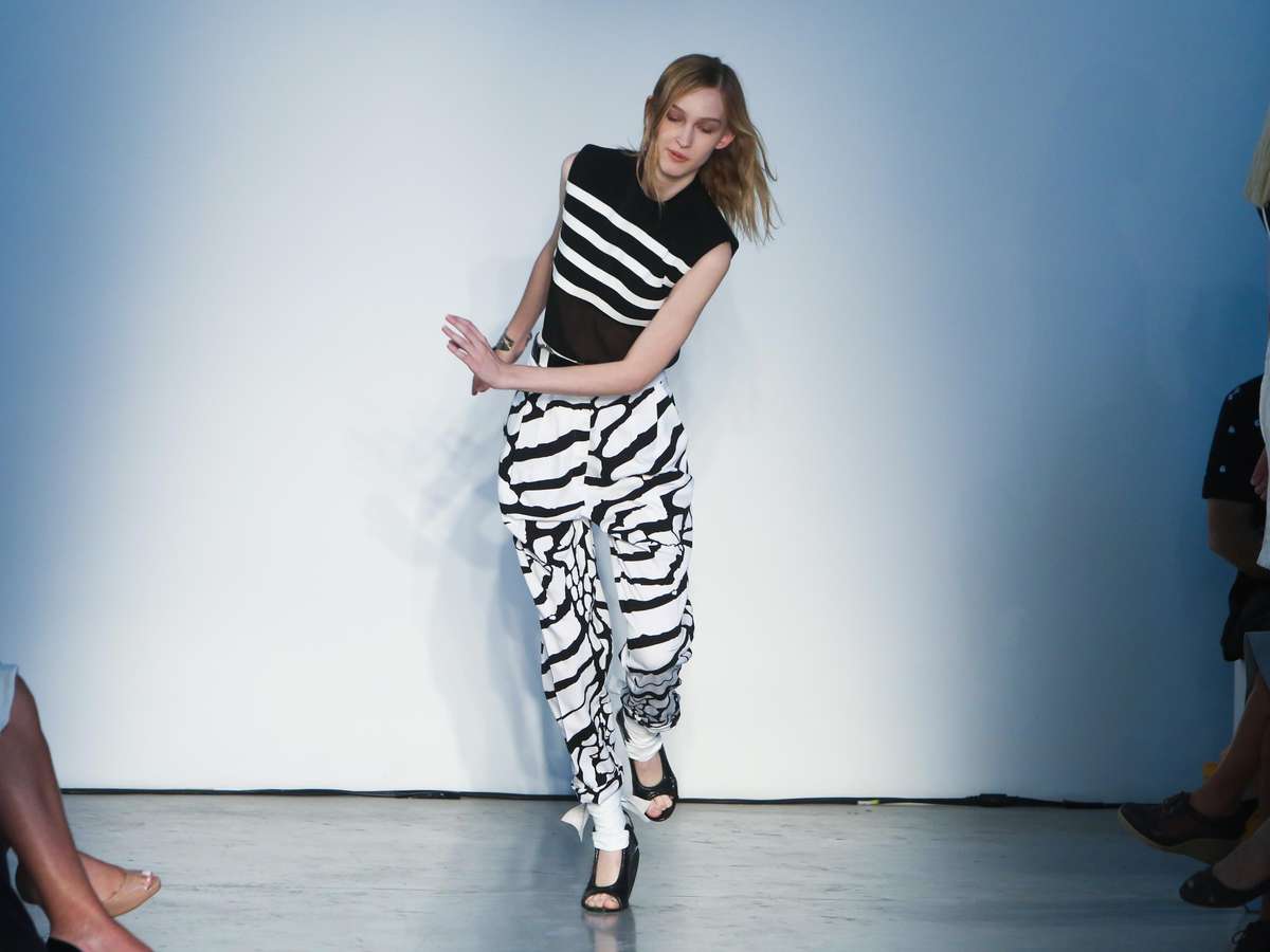 Uma das modelos acabou escorregando na passarela, tombou levemente para o lado e...
