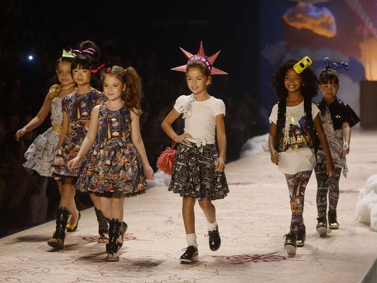 O estilo praiano, com peças soltinhas, dominou a chegada ao Havaí, e em Nova York, o estilo urbano, estampas dos letreiros da Broadway e os Yellow Car aparecerem nos looks. Tudo com muito brilho. Paetês nas mochilas, sandálias gladiadores, babadinhos e as franjas, muitas, franjas, estão no catálogo de verão da marca infantil, uma das patrocinadoras do evento. Na cartela de cores, não falta o rosa, tom da personagem da marca, além de branco, preto, naturais, azul-claro, amarelo e marrom.