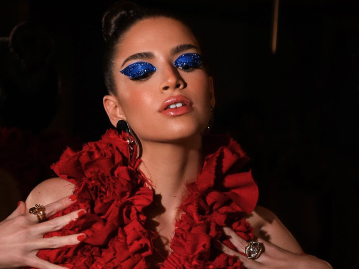 O vestido usado por Lelê Burnier vem com a parte de cima em formato que lembra coração. Com recortes e assimetrias, ficou perfeito com a meia também vermelha, outra trend em alta, e o sapato da mesma cor. A sombra azul criou contraste na produção. Lelê é conhecida no TikTok por pedir para os seguidores ajudarem a escolher seus looks, em geral muito coloridos, em vídeos no formato 'get ready with me' (algo como, vista-se comigo). Nem sempre, porém, ela segue os conselhos do público.