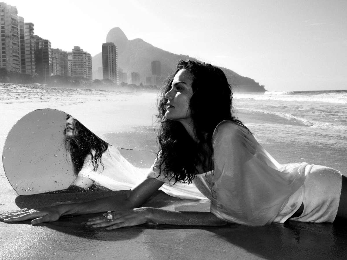 Bárbara Fialho - O look foi desenhado e desenvolvido exclusivamente para o clipe por Lucas Anderi. Usamos o arquétipo da gaivota como inspiração. Uma ave inteligente, ágil, que se adapta a qualquer situação com leveza. O Lucas fez uma capa de seda que voava com o vento da praia quando eu caminhava e eu me senti voando.