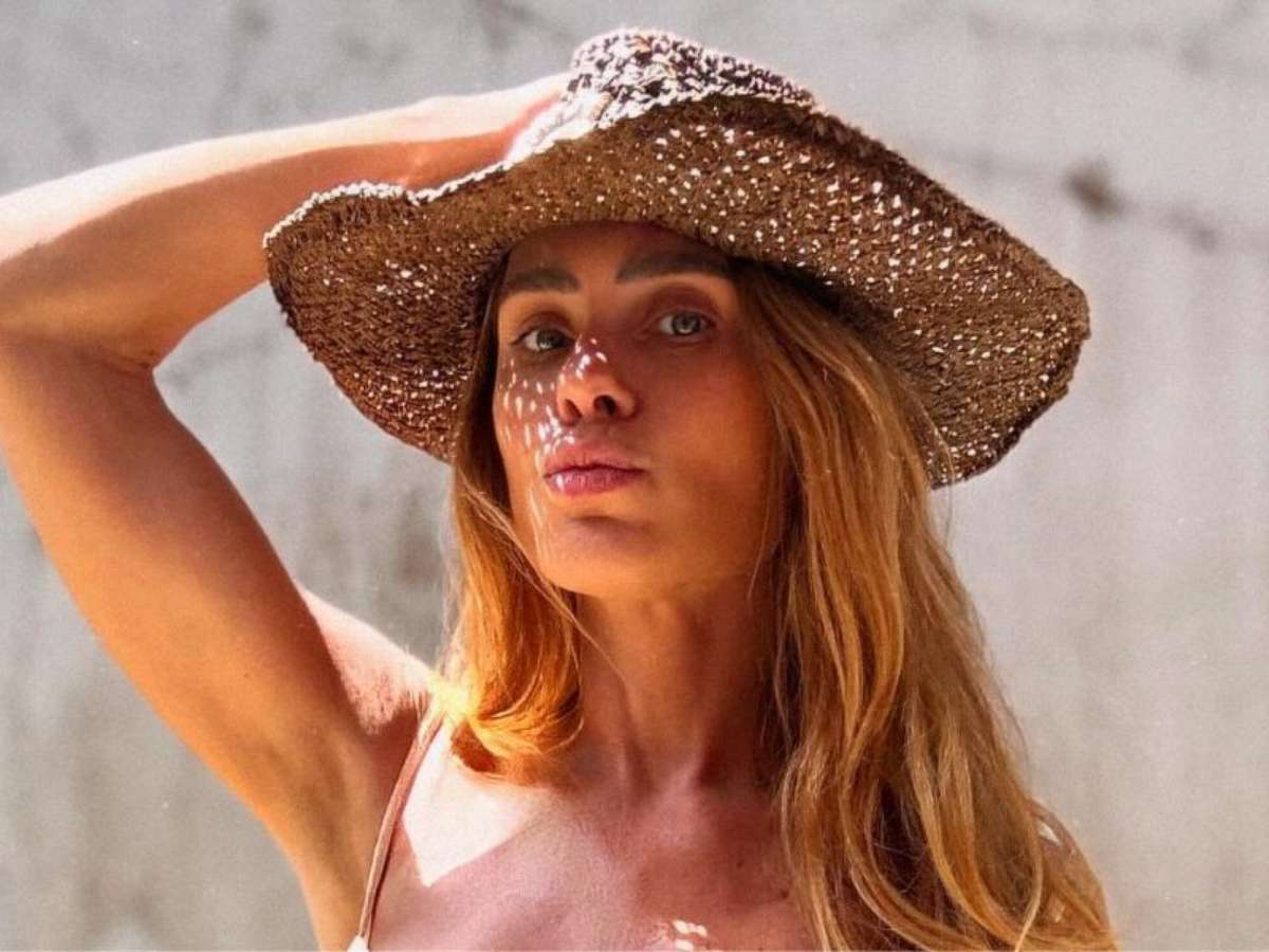 busto. A calcinha é básica e lisa. O conjunto custa R$ 550. Ela completou o look com outro item que promete continuar como hit do verão: o chapéu de crochê modelo western, com aba larga e enfeite frontal em forma de caracol — da collab entre Feline e Tais Costa Hats.