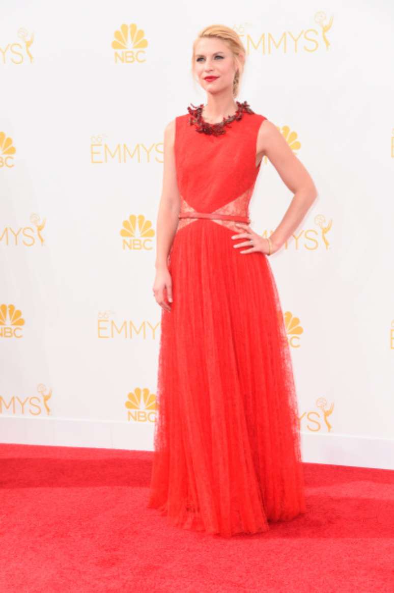 Se Claire Danes acertou no look anterior, neste errou completamente. O vazado na lateral está lá, mas tem tantas outras informações no look que o que poderia ajudar a ficar com uma cintura mais marcada se perdeu em estampas, assimetrias e faixas (Foto: Joe Kohen/Getty Images)