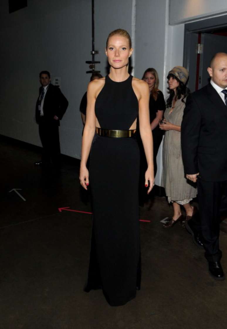 Gwyneth Paltrow é uma que adora o detalhe na lateral. Veja como o recurso nesse vestido, sem decote, faz toda a diferença, ainda mais com o cintinho metalizado (Foto: Larry Busacca/Getty Images)