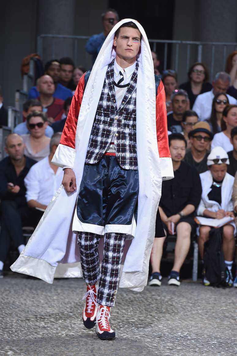 A Moncler Gamme Bleu montou um ringue para o desfile na semana de moda masculina de Milão. Por ele, passavam modelos vestidos com muita sobreposição de peças, listras e combinação de tecidos fluidos e outros mais firmes