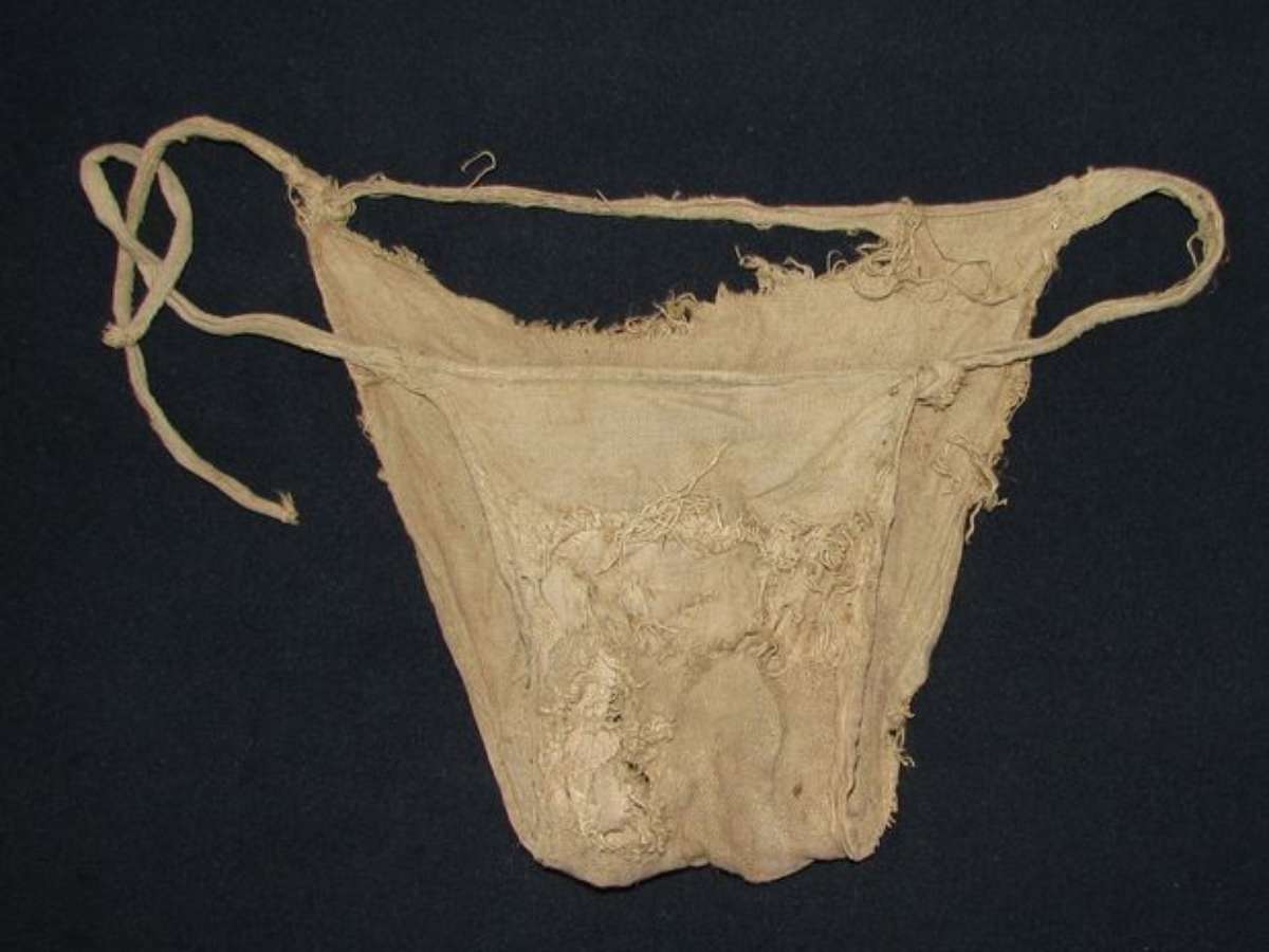 Apesar do estado do tecido, pode-se concluir que uma das calcinhas encontradas, com tiras para amarrar nas laterais, lembra os biquínis atuais