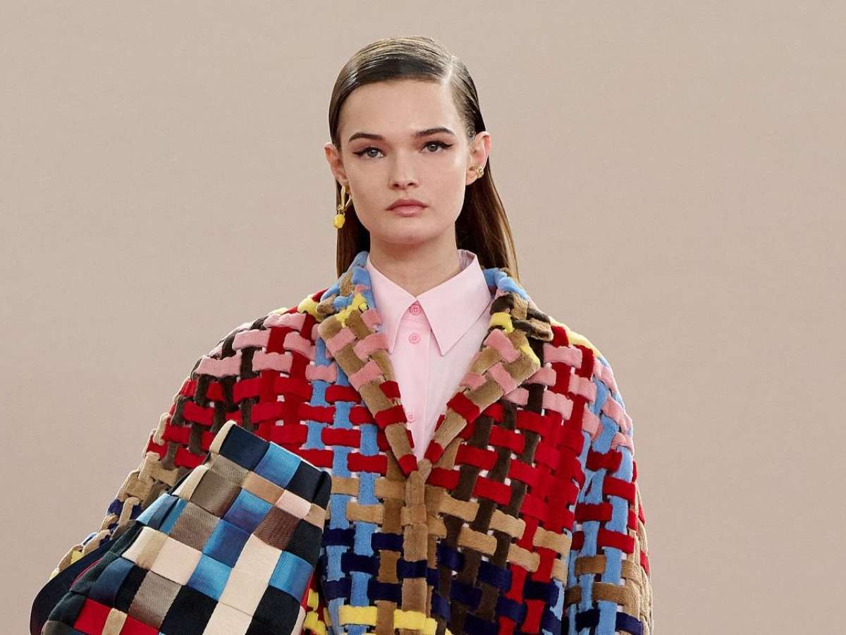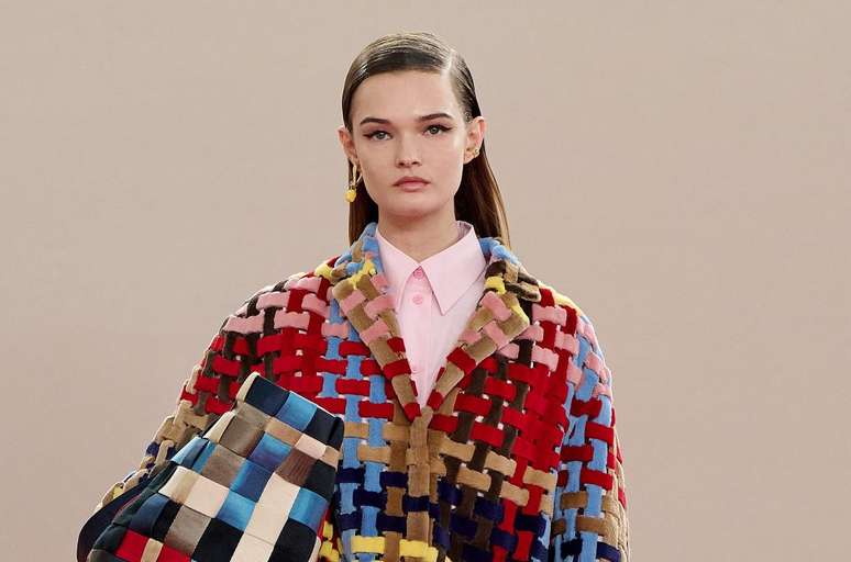 Destaque também para o casaco composto por tiras coloridas entrelaçados, de várias tonalidades, acompanhando por bolsas também de fitas trançadas.