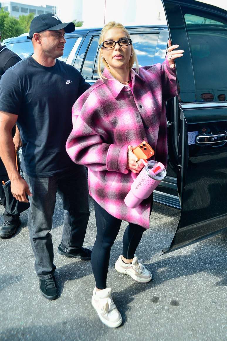 Para a passagem por São Paulo, Virgínia usou legging preta, pulseiras, óculos com lentes alaranjadas, outro relógio e tênis chunky branco. No evento, tirou a jaqueta e ficou com a camiseta de sua marca, a WePink.