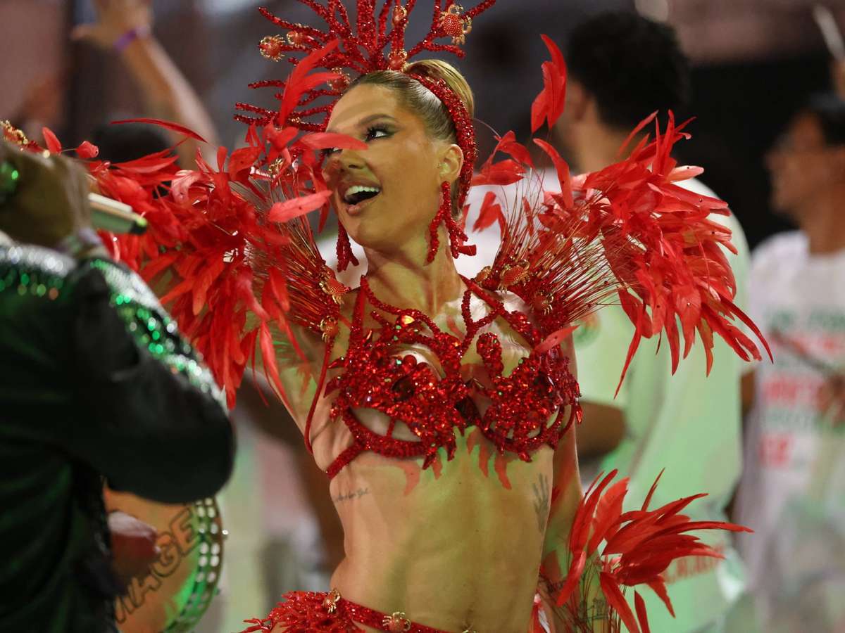 Gkay foi de saia com franjas e top, ambos em vermelho e branco com brilho, para o desfile para a Salgueiro. O look é assinado por Michelly X.