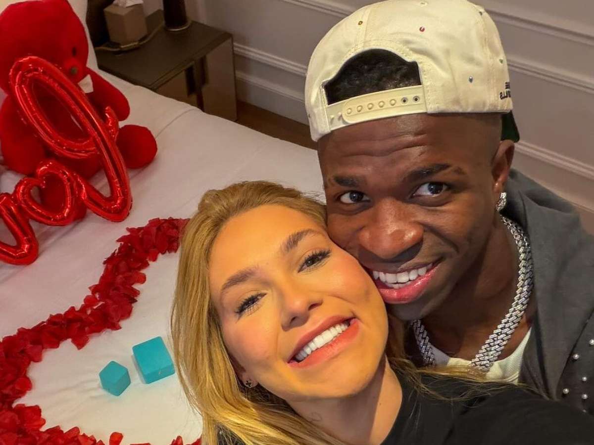 O pedido de namoro feito por Vini Jr para Virgínia, com direito a balões, pétalas de flores e ursinhos de pelúcia no quarto do hotel, foi feito oficialmente nesta terça-feira (29). Na cama, aparece ainda caixa de joias que parecem ser da Tiffany. Nas fotos publicadas nas redes sociais, Virgínia aparece com calça jeans destroyed em tons de cinza e camiseta preta básica de mangas compridas.