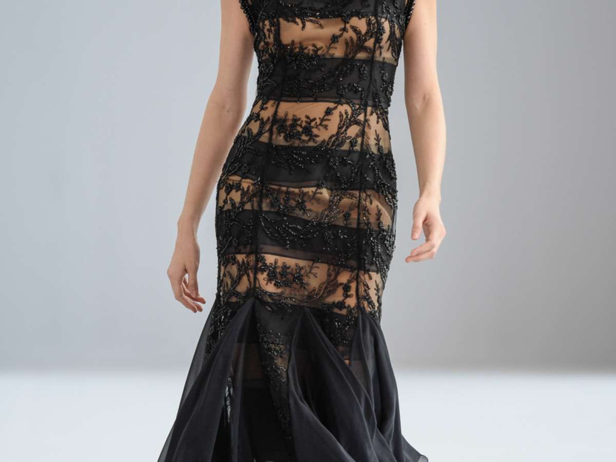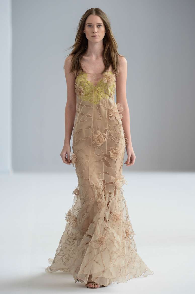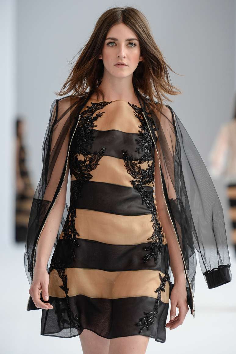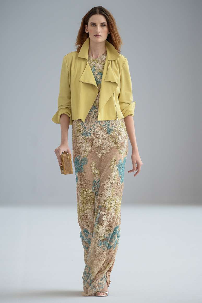 Fernanda Tavares abriu o desfile com um vestido longo justo de renda bordada com nesgas na barra em tom verde-claro e fechou com preto em faixas transparentes que davam a impressão de falso nude.