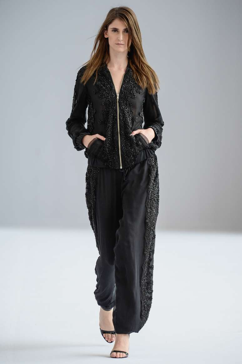Destaque para as aplicações de pérolas falsas tingidas à mão, em cores que representavam os vários estágios da jabuticaba, das tonalidades mais verdes às mais escuras quase pretas, vistas em blusas com modelagem de camiseta e também em barras de algumas peças. As jaquetinhas curtas de couro molinho e as jaquetas de organza com corte esportivo se misturavam aos vestidos de festa, provando que a formalidade das roupas formais pode ser quebrada com delicadeza. Daiane Conterato também pisou a passarela da Vivaz com um conjunto de calça larga e jaqueta esportiva preta, com bordados na lateral. A convivência perfeita do clássico e do despojado.