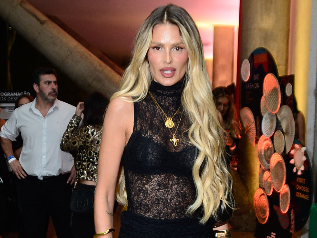 Yasmin Brunet também estava de all black (tudo preto). Posou com vestido longo de renda, com a sensualidade da transparência.