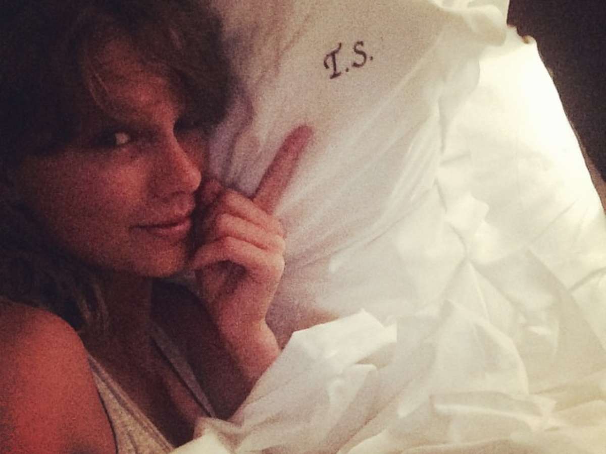Taylor Swift entrou na onda das famosas que usam o Instagram para mostrar um pouco da intimidade com a 'cara lavada'. Deitada em uma cama, ela aponta para suas iniciais bordadas na fronha branca. Os seguidores prontamente comentaram, com mensagens como "fofa" e "eu te amo, Taylor"