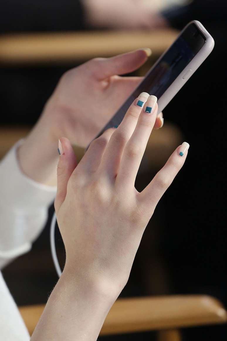 Quer copiar a opção do desfile da Cushnie Et Ochs, na Made Fashion Week, em Nova York? Então, lixe as unhas quadradas, mas levemente arredondadas nas pontas. Passe uma camada de base e deixe secar. Recorte um adesivo verde de unha, em formato de um quadrado, e cole próximo à base da unha. “Também é possível fazer o detalhe com esmalte verde ou em outras cores, como azul, rosa e vermelho”, disse a manicure Thaise.