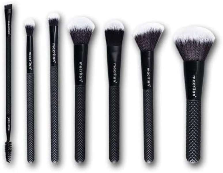 Prova de que dá pra ter qualidade sem gastar muito. O Kit Noir da Macrilan reúne 7 pincéis profissionais que funcionam bem com produtos líquidos, cremosos e em pó.