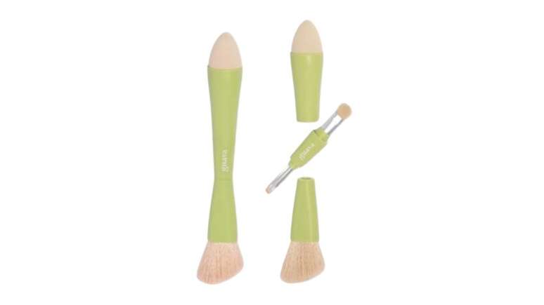 Pincel com design inovador Guava que une 4 aplicadores essenciais em 1: esponjinha + pincel faz tudo (pó, contorno e blush) + pincel concha (sombra) + pincel angulado (sobrancelha e delineado)