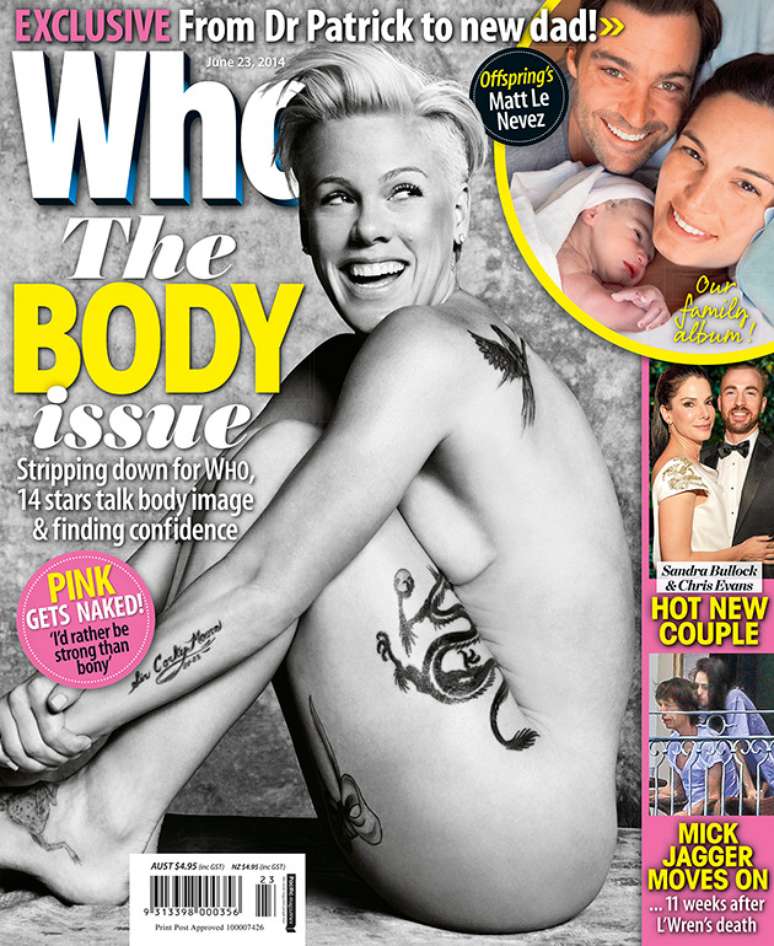 Três anos após dar à luz, a cantora Pink posou nua para a capa da revista Who: “estou na minha melhor forma de toda a vida”, disse ela em entrevista à publicação. Pink mostrou um corpão e contou ser confiante em relação às suas curvas. Embora esteja 4,5 kg mais pesada que antes da gravidez, tenta ser “muito mais paciente”.