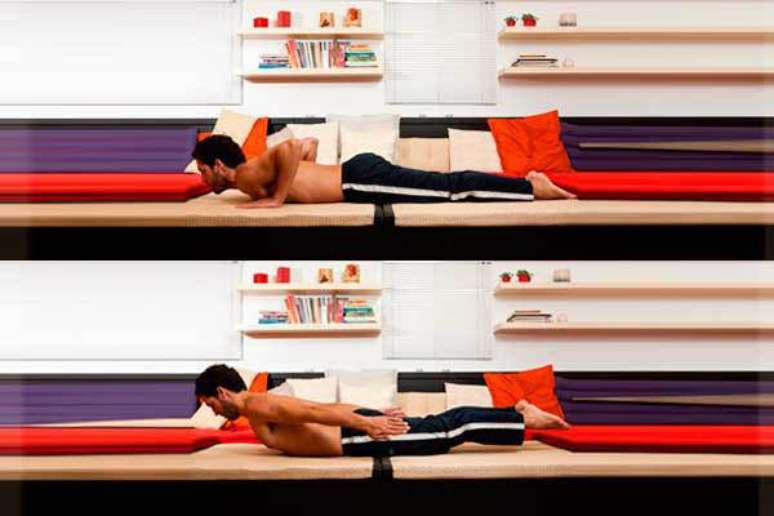 Ainda na mesma posição, flexione o corpo para baixo, deitando-o no chão com os cotovelos para trás. Tire as mãos do chão e, sem elevar os ombros, suspenda os braços para trás, enrijecendo-os levemente e elevando as extremidades do corpo. Mantenha somente a barriga e o quadril no chão. Não contraia o pescoço durante a posição, mantendo a cabeça voltada para o chão.