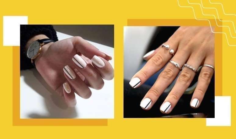 Para quem quer inovar e dar uma cara nova para aquele esmalte branco, o ideal é apostar nas delicadas listras pretas. O detalhe é superfácil de se fazer, basta usar um pincel de nail art bem fininho ou, então, um palito. Agora, é só aplicar o desenho da sua preferência, pode ser em todas as unhas ou apenas em algumas.