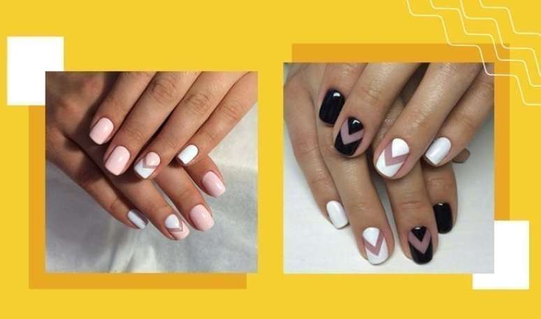 Se quiser um visual moderno e descolado, o ideal é apostar em desenhos geométricos. Escolha um uma cor clara, para passar por baixo, e faça os detalhes em preto ou em um tom mais escuro. Dá para usar o próprio pincel do esmalte e um palito, o importante é ter criatividade na hora de pintar as unhas.