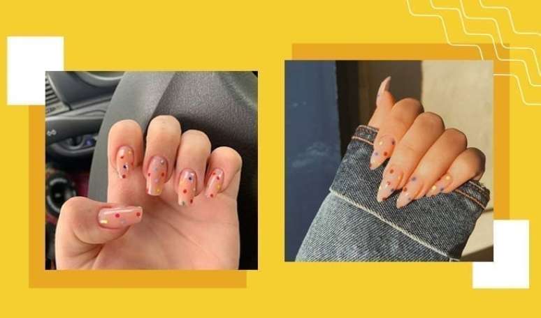Um dos modelos de unhas minimalistas mais fáceis de se fazer é o pontilhado. A ideia é fazer várias bolinhas, com o palito mesmo, utilizando diversas cores de esmalte por cima de uma base transparente. Dá para fazer os pontos menores e mais próximos ou maiores e mais afastados, fica a seu critério.