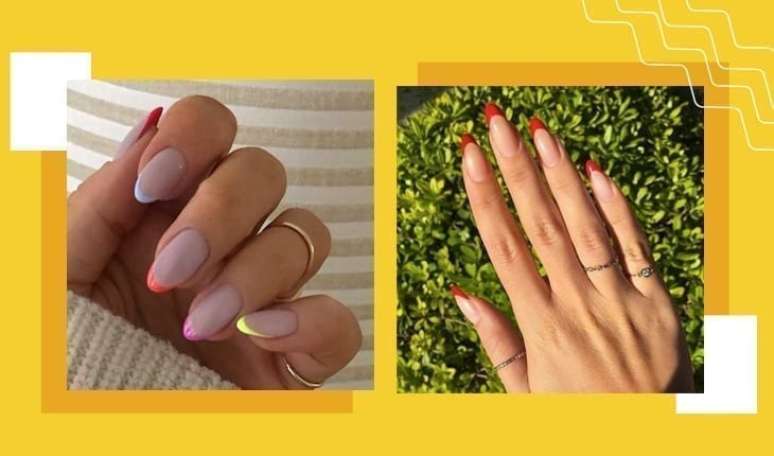A famosa francesinha todo mundo já conhece, mas que tal trazer um pouco mais de cor para as suas mãos? Apesar desse modelo ser chamado de inglesinha, o processo para se fazer é muito parecido. Dá para utilizar um pincel fininho ou, se quiser mais praticidade, colocar um pouco de esmalte na palma da mão e passar as pontas das unhas nela, para espalhá-lo por todas as extremidades. Se quiser deixar a sua nail art divertida, aposte em um tom para cada dedo.