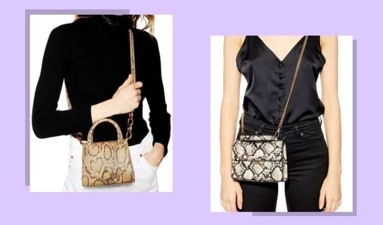 Outra estampa que virou queridinha das influenciadoras é o animal print. Aposte em minibolsas que imitam pele de cobra, vaca ou onça e combine com peças de uma única cor. Elas são superbonitas e capazes de trazer elegância para qualquer visual, mas lembre-se de optar por acessórios que não utilizam pele verdadeira.