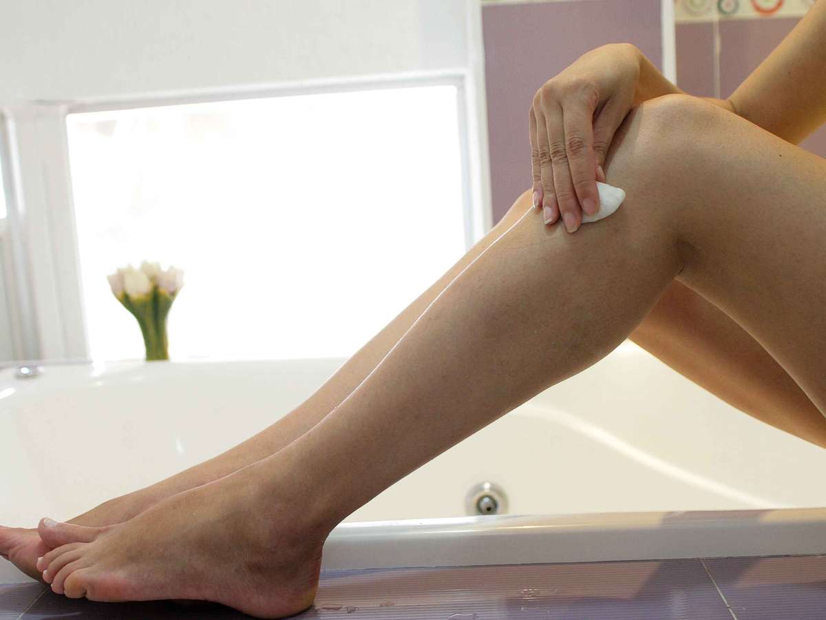 Certo: com movimentos leves, passe o hidratante nas pernas