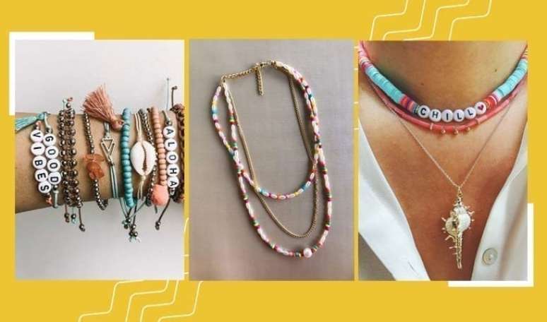 Uma das maiores tendências deste ano com certeza são as miçangas. Coloridas e com diversas formas, elas são capazes de deixar qualquer look mais divertido. Você pode fazer uma composição com outros colares e pulseiras, o importante é ser criativa. Os queridinhos das celebridades, no momento, são os modelos com letras do alfabeto, que formam palavras e até mesmo nomes.