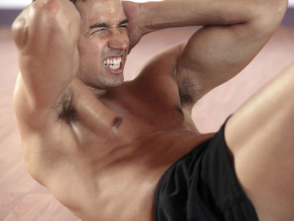 Agora é a vez do abdominal frontal solo. Deitado com o abdômen para cima, flexione os joelhos, mantendo os pés apoiados no chão, e realize a flexão do tronco olhando para o teto, assim mantém a coluna cervical alinhada. São três séries de 12 repetições, com 30 segundos de pausa entre elas