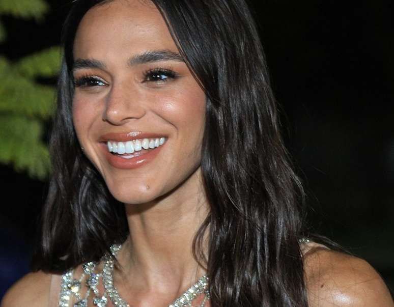 Ao chegar na festa, Bruna Marquezine usou vestido customizado Gucci. A peça sensual vem com cristais e tramas abertas. Por baixo, body também bege, deixando a silhueta do corpo em evidência. Para completar, escarpim também bege. Como foi feito sobe medida, não deu para pesquisar o valor.