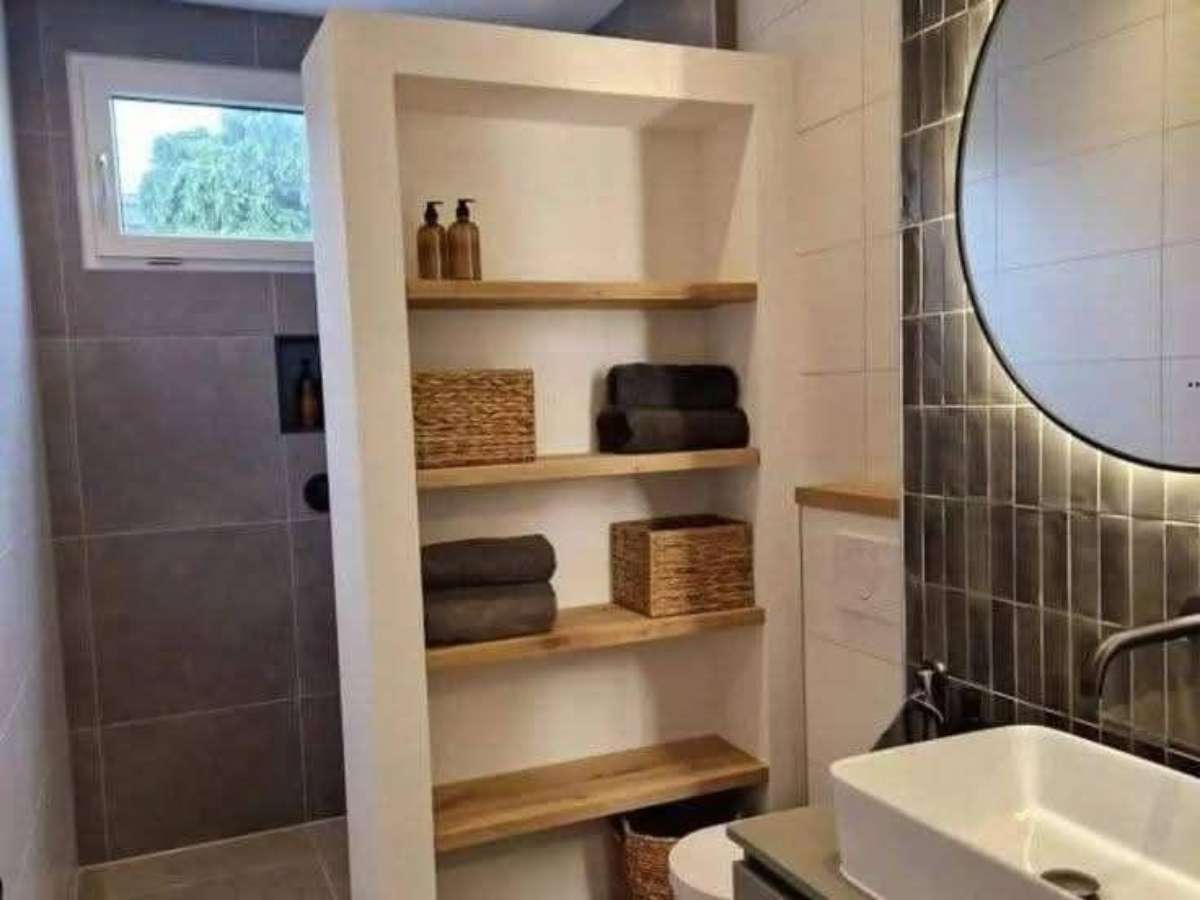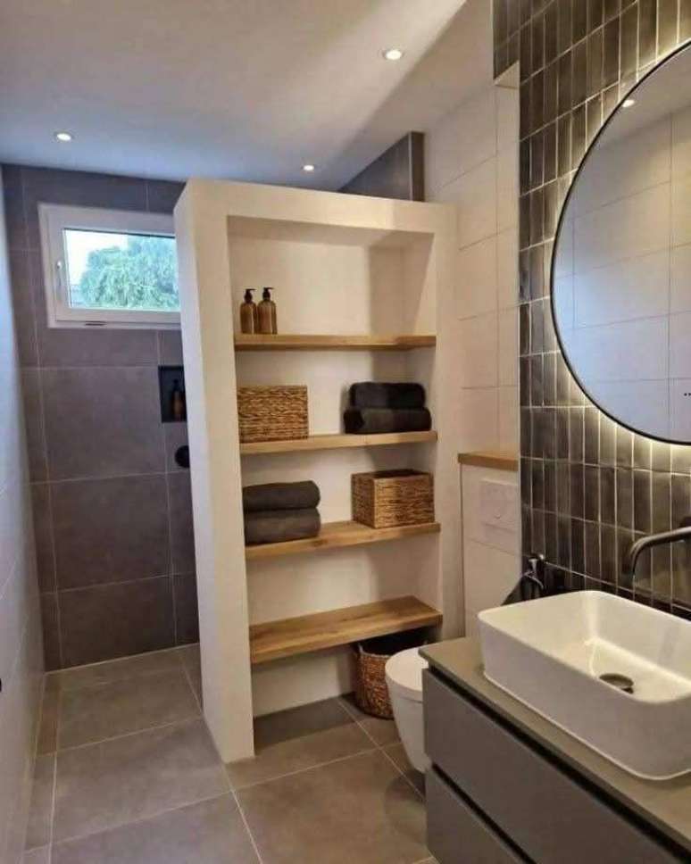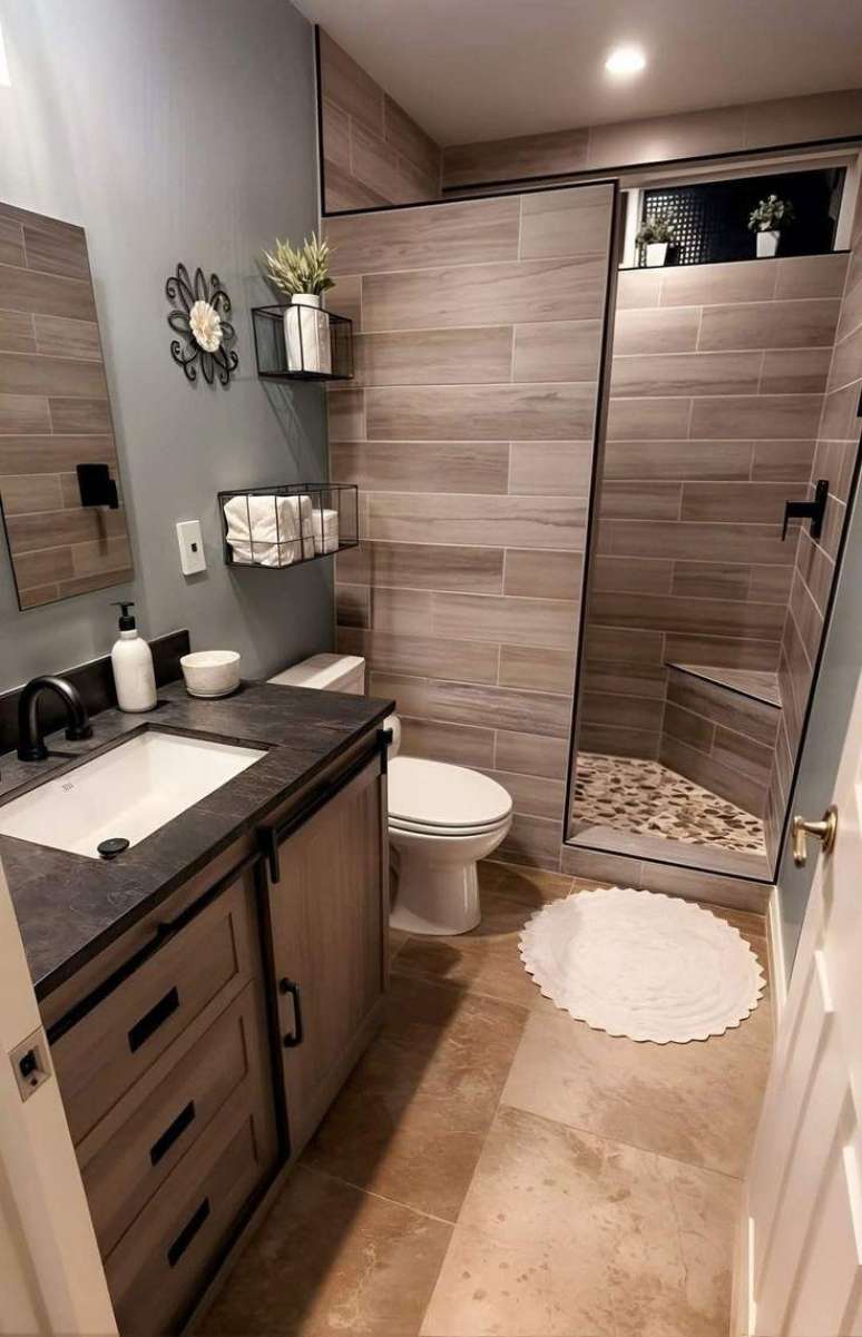Iluminação quente, nichos embutidos e metais modernos valorizam o espaço. Plantas resistentes à umidade também ajudam a criar um clima de spa em casa.